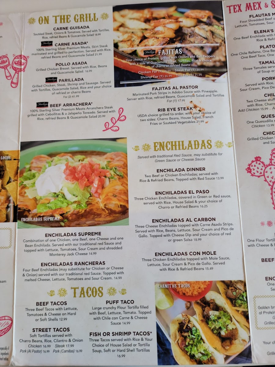 Two beef or chicken enchiladas; served with rice and refried beans, topped with red sauce.