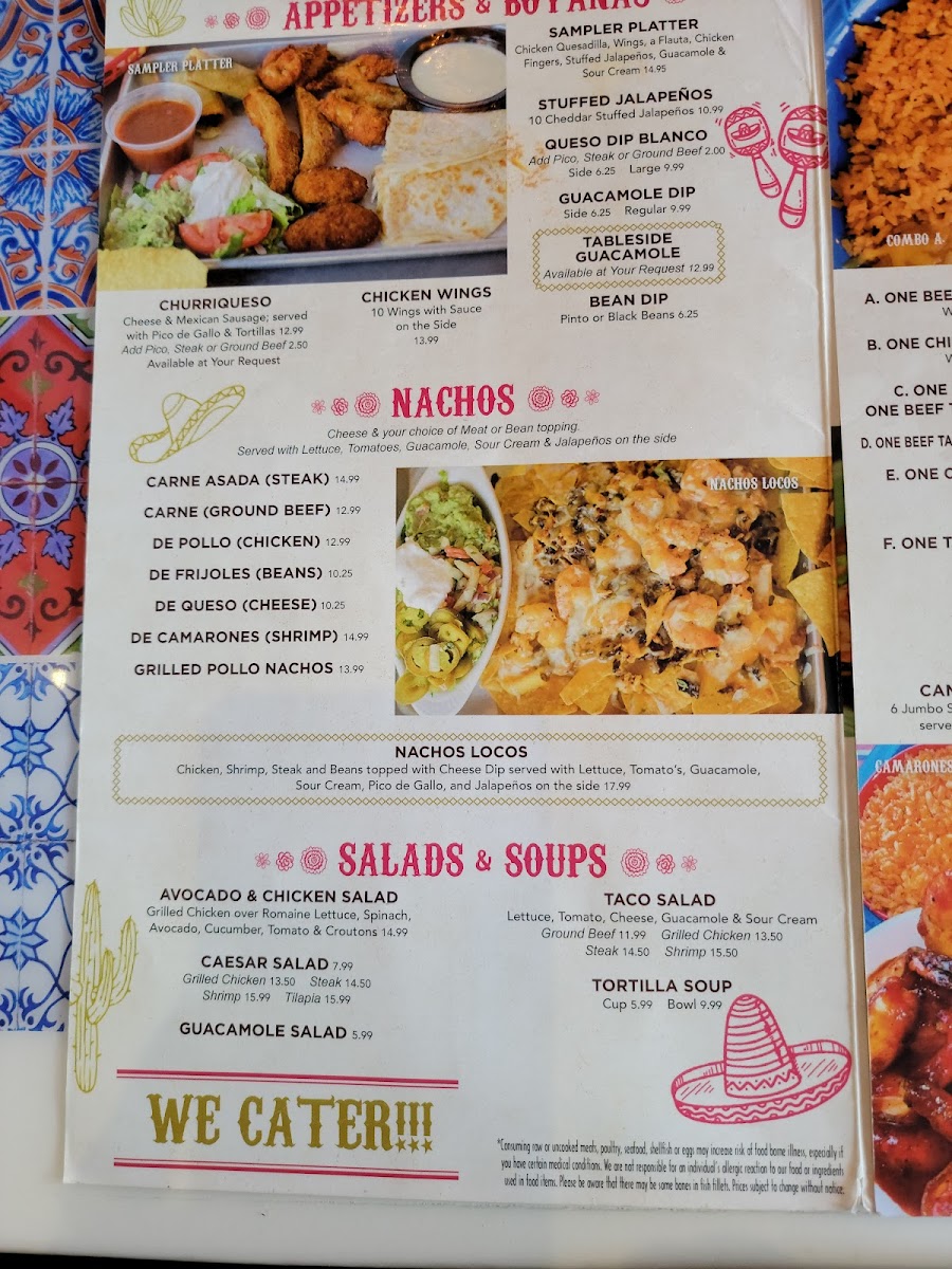 Chicken, shrimp, steak and beans topped with cheese dip served with lettuce, tomato's, guacamole, sour cream, pico de gallo, and jalapeños on the side